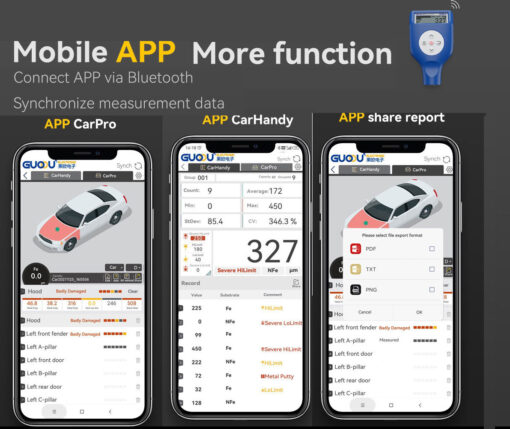 GUOOU GC8102 Car Paint Tester is a device rang up to 3000um and could be attached with Android App and easy to check the whole car paint condition part-wise and you can share an automated created summary just after completion of the Car paint Test. It can check paint both ferrous and No ferrous type matel.